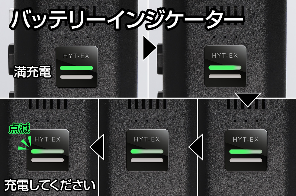 - バッテリーインジケーター:ブロワーを起動中、電池残量に応じてインジケーターが点灯。