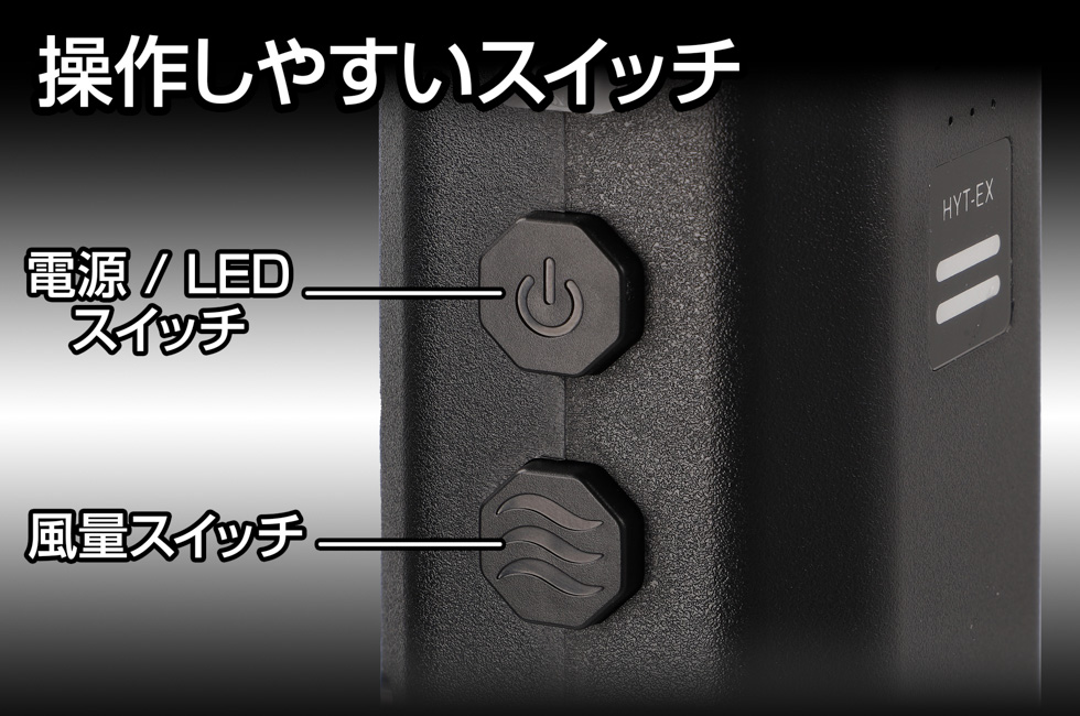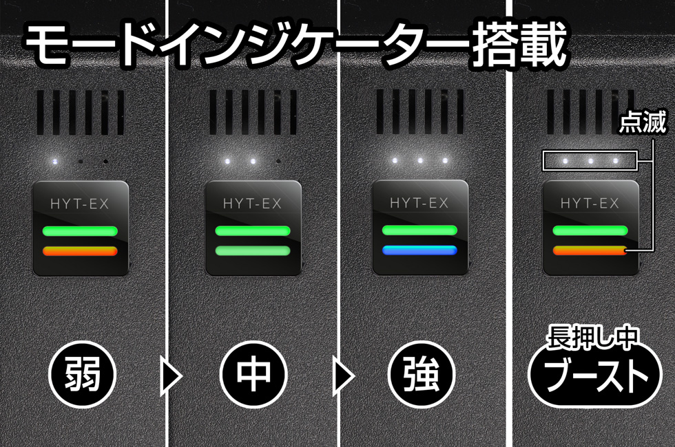 - ブーストモード:電源を入れた状態でモードスイッチを長押しすると、長押ししている間だけ最大風量で作動。