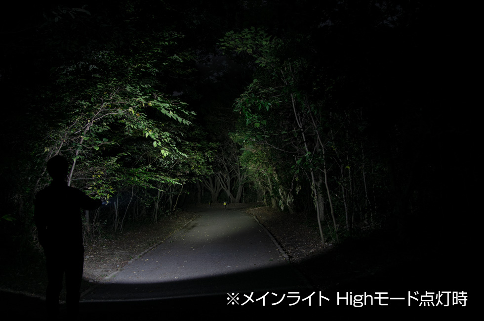 - 点灯時間(約):1.5時間(メインライトHighモード)/ 21時間(メインライトEcoモード)/ 6時間(サイドライト点灯)/ 11時間(サイドライトUV)