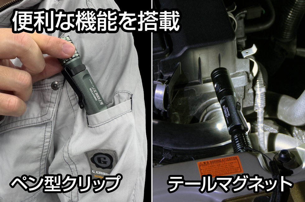 - ツインスイッチ:テールスイッチでON/OFF、サイドスイッチでモード切替え