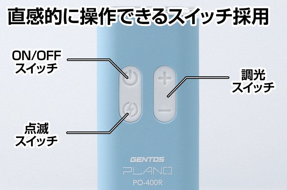 - スイッチロック(誤操作防止)機能:点灯・消灯中ともに、ON/OFFスイッチを長押しするとスイッチ操作のロック/ロック解除ができる。