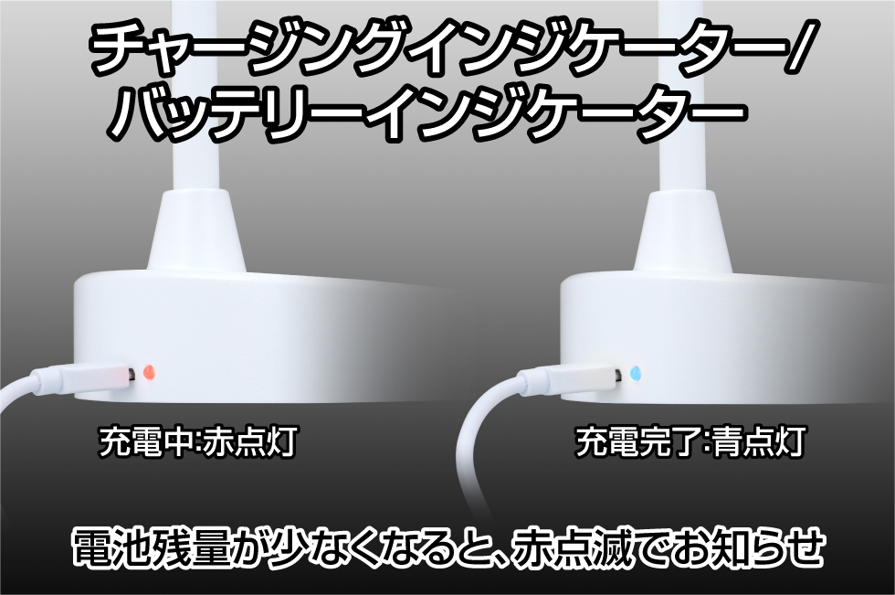 - バッテリーインジケーター:電池残量がなくなる前に本体背面のバッテリーインジケーターが赤点滅しお知らせ。