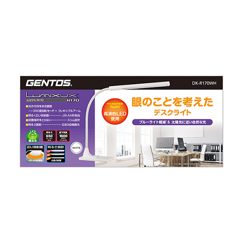 - 眼のことを考えたデスクライト:高演色(Ra95)LEDによりブルーライトを軽減※し、太陽光に近い自然な光を実現。眼が疲れにくい。※当社の旧製品(平均演色評価数Ra80のLEDを使用)と比べ、ブルーライトを約20%軽減