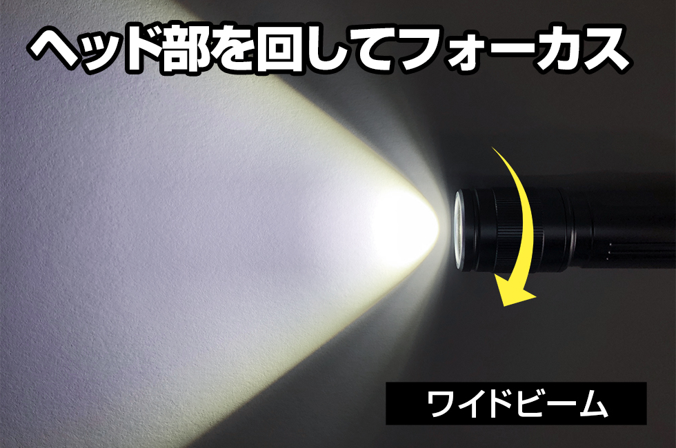 - フォーカスコントロール:フォーカスヘッドを回すことでスポットビームからワイドビームまで無段階に調節可能。