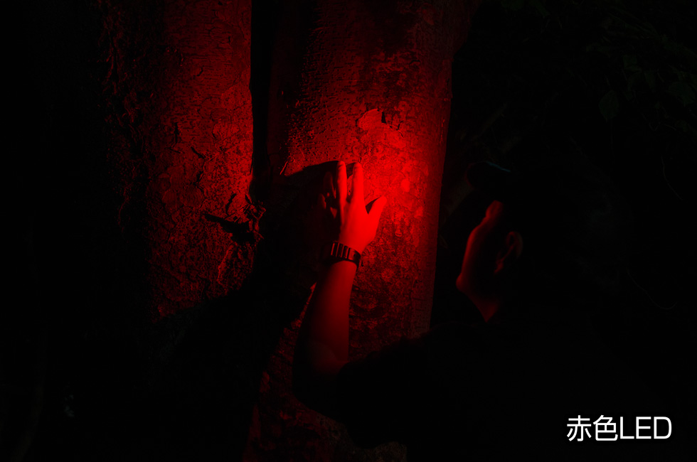 - 赤色LED:暗い場所で手元を照らすなど、メインLEDでは明るすぎる際に便利。