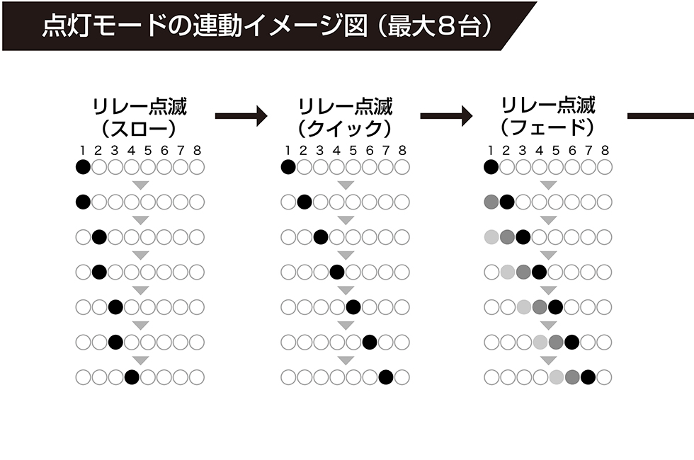 - モードメモリー機能:消灯前に点灯したモードを記憶し、再度点灯させた時に同じモードで点灯します。