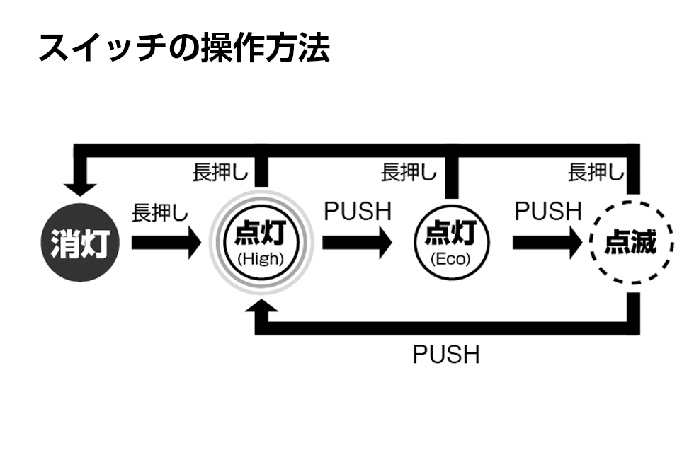 - 点灯時間(約):1.5時間(Highモード)/ 8時間(Ecoモード)/ 12時間(点滅)