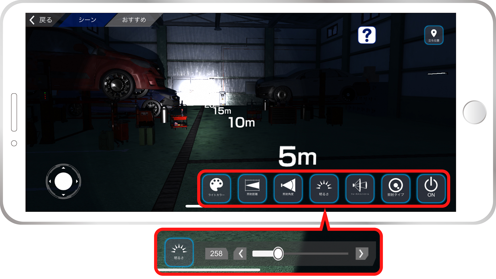 「カスタムシミュレーター」では、自分でライトのスペック(明るさ、照射距離など)を設定し点灯させることができます。