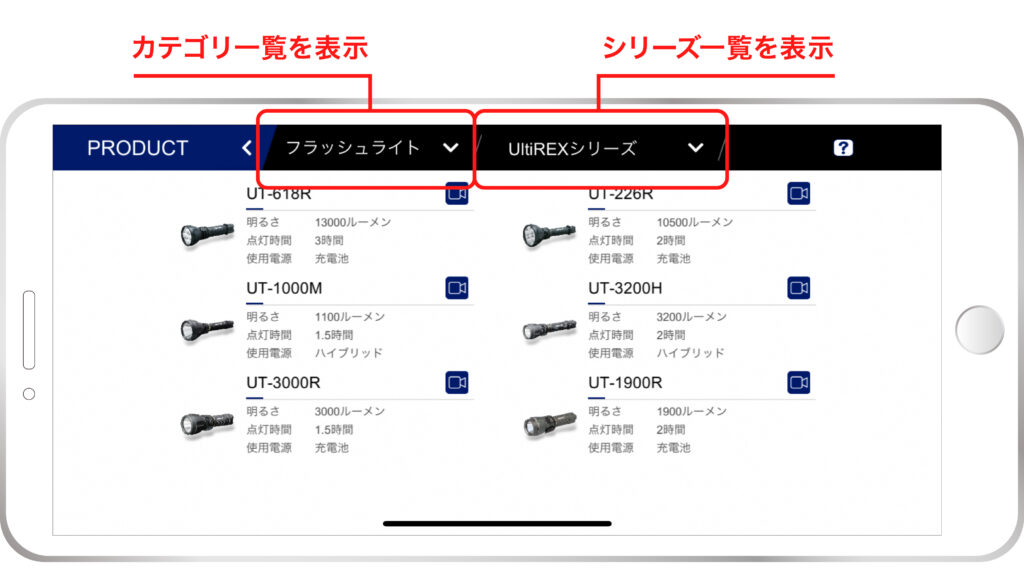 フラッシュライト、ヘッドライト、ワークライトの製品カテゴリー及び、シリーズ毎に製品がカテゴライズされています。