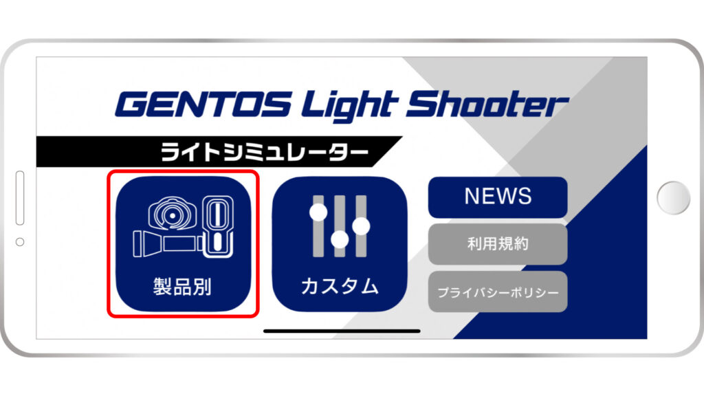 シミュレーターには、実際のジェントス製品の明るさを体験できる「製品別シミュレーター」と、自分の好みのスペック(明るさ、照射距離など)を設定できる「カスタムシミュレーター」の2種類があります。